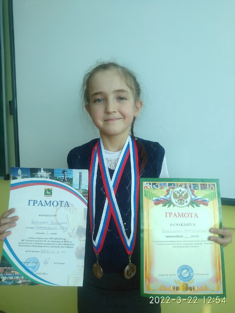 Во время весенних каникул, она участвовала в зональной научно-практической конференции «Первые шаги в науку -2022» и защитив проект «Мой любимый вид спорта-настольный теннис», стала победителем в номинации «Лучший рекламный проект».